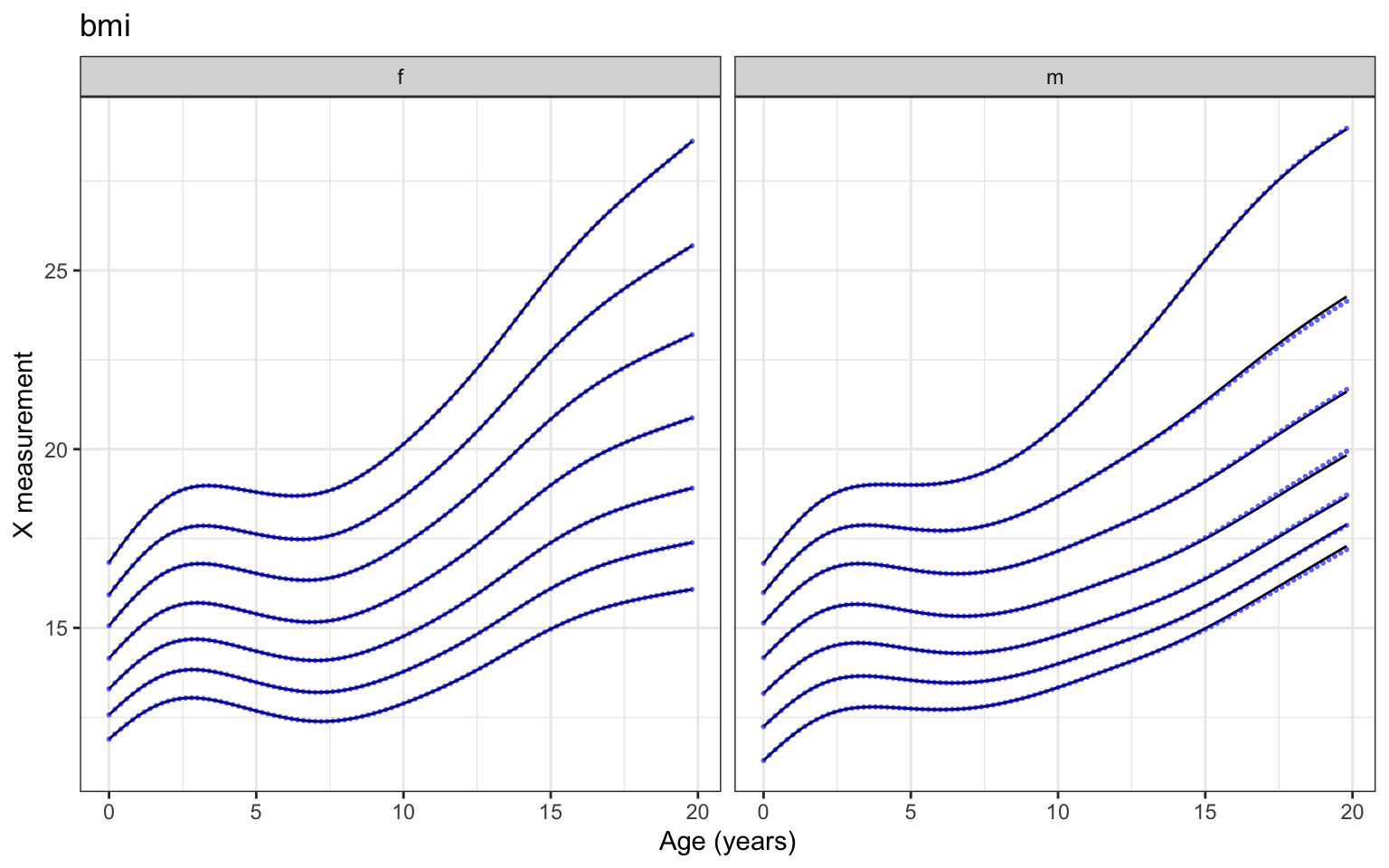 The LMS estimation results include some per-group statistics (like RMSE, R-squared, and number of observations). The RMSE values are quite good but not perfect, as they should be if the percentile values were all calculated correctly from source LMS values.This imperfect convergence reflects problems with the source data.