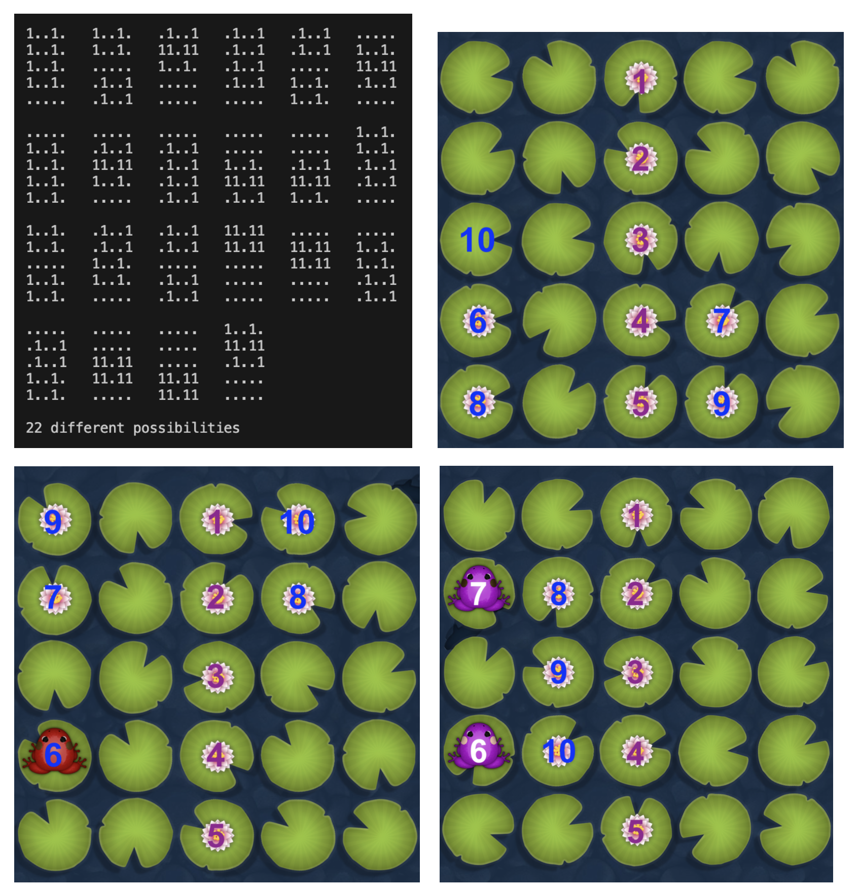 - 31.8% chance for the “best” scenario of selecting 10/10 empty lilypads (Upper Right, with #10 clear)