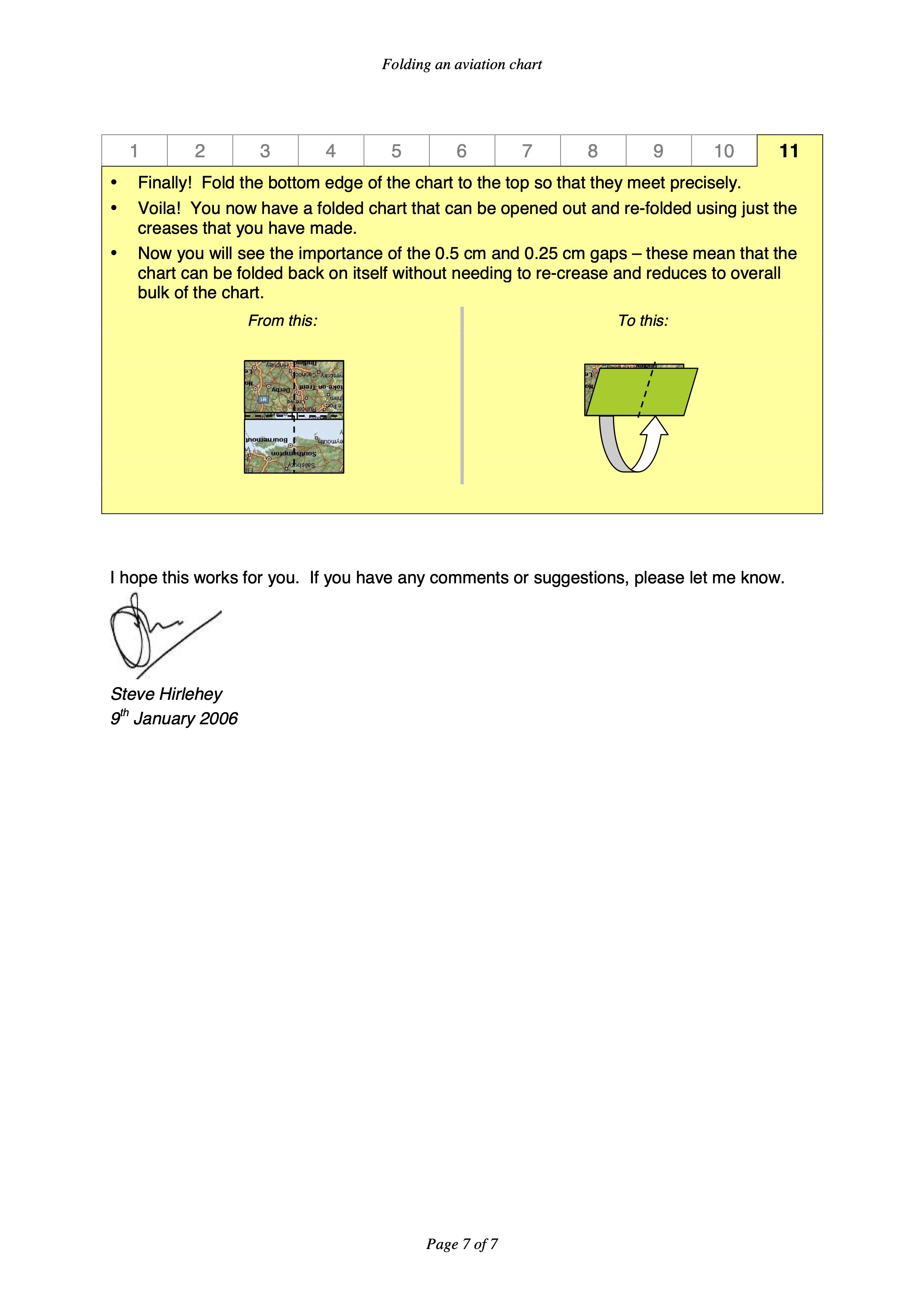 The improvement was to NOT make the folds evenly-spaced, but to leave small amounts of wiggle room to allow the folded map to lie more flat when folded and back-folded upon itself. In the video, you can see printed instructions that looked really clear, but sadly the link to the PDF referenced in the video (somewhere on https://www.aopa.co.uk/) no longer works, nor did Steve Hirlehey’s own link to the method.